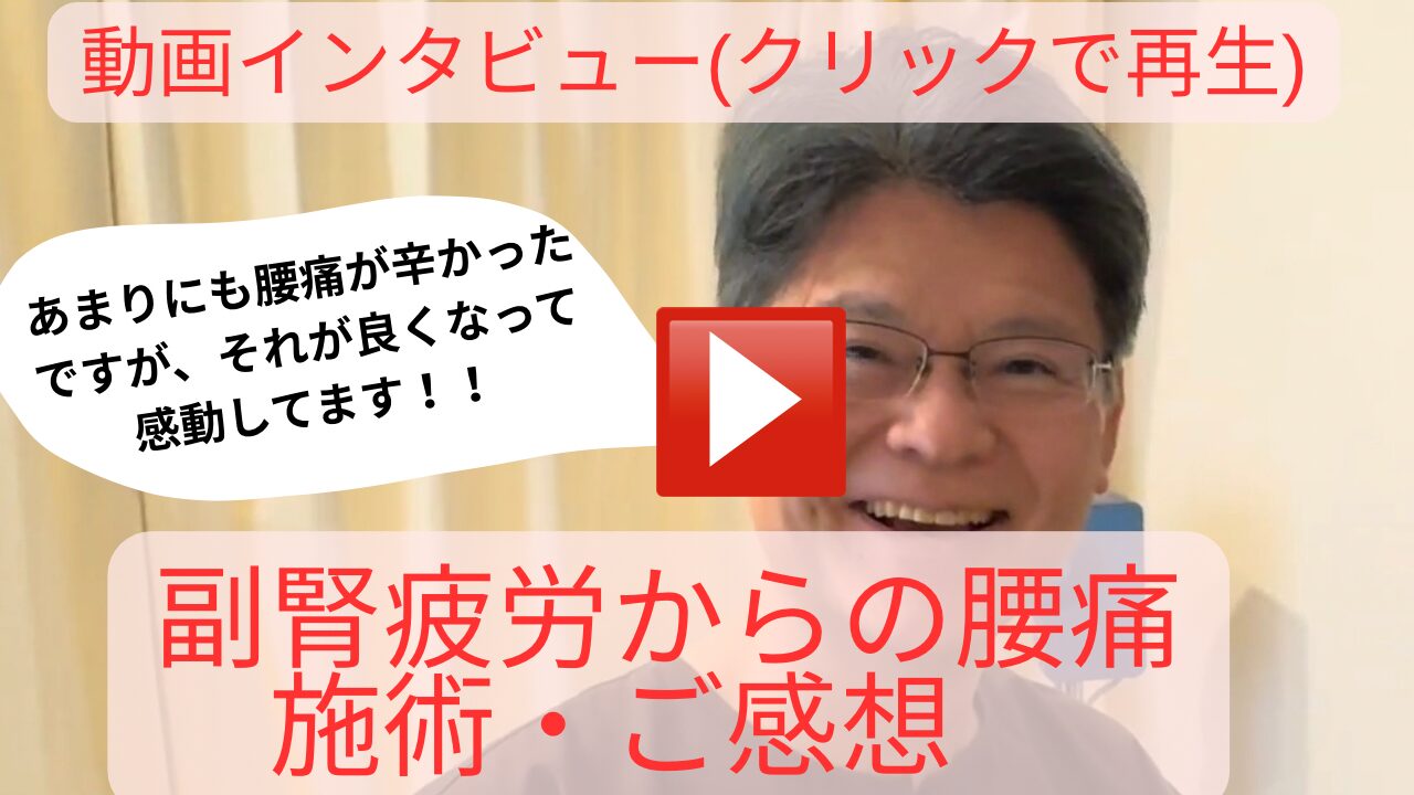 仕事のストレスで、長年の、あのまぁ15年ぐらい前から腰がだるくて。ちょっと調べたら副腎疲労に付随する、腰の痛みというか、こりだったと思うんですけども、まぁそれがあまりにも辛いので、まぁ午前中、ほとんど仕事もできない状態が長年続いて。であの藁をも縋る思いで来させていただきました。